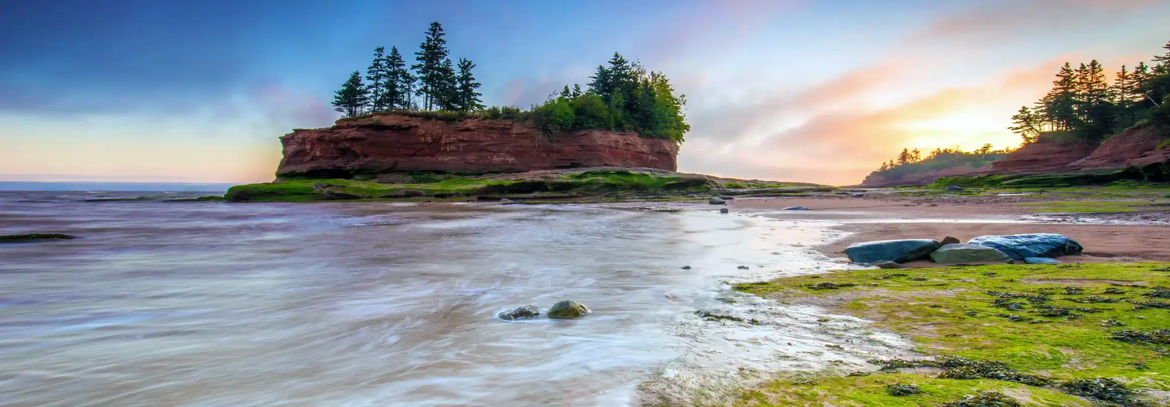 Depart Wolfville by vehicle, transferring 2.5 hours around the Minas Basin, with a one-hour stop at Burntcoat Head, where the world's highest tides have been recorded. Walk on the ocean floor, tide permitting, then continue to your afternoon hike at either Thomas’ Cove or Five Islands. Both trails feature striking red cliffs, sea stacks, and expansive views from the opposite side of the Bay of Fundy. Tidal bore river rafting is an alternative activity, available only when tide times are appropriate and there is a group consensus. Finish the day in Parrsboro, where you may have the option to attend a live performance at Ships Company Theatre.